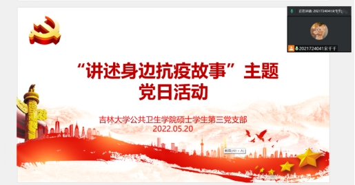 硕士学生第三党支部组织开展“讲述身边抗疫故事”主题党日活动。此次活动共27名党员和预备党员参加,由战勇智、唐志滔和岳宝丽三名党员同志讲述了疫情期间作为长春市疾病预防控制中心志愿者的抗疫故事。