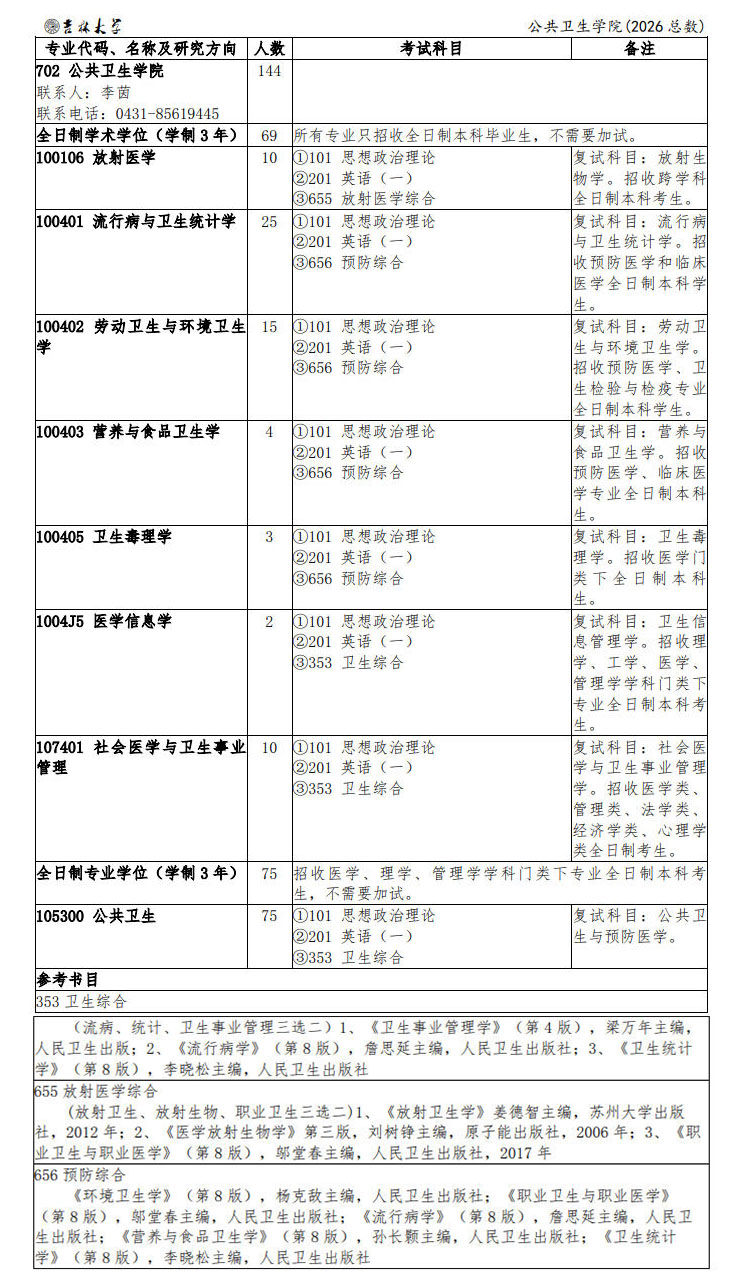 各位考生:9月30日,吉林大学公布了《吉林大学2026年硕士研究生招生章程及招生专业目录》,公共卫生澳门六合彩 2026年计划招收硕士研究生144人,具体目录见下。欢迎各位考生积极报考,如有疑问,欢迎加入QQ群咨询:学硕QQ群:1011413794,进群密码:26年报考学硕。专硕QQ群:718111221,进群密码:26年报考专硕。