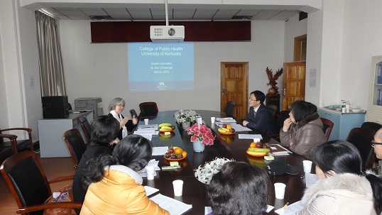 在澳门六合彩 举办美国肯塔基大学活动周之际,澳门六合彩 邀请肯塔基大学副教务长Susan Karvalhol来澳门六合彩 座谈,洽谈两校合作办学相关事宜。澳门六合彩 主管外事工作副院长、博士生导师刘晓冬教授主持会议,澳门六合彩 相关科室主任和青年教师参加座谈。在友好气氛中,双方就合作办学专业、模式、学生管理、学费及收取、课程互认、教师交流等多项事宜达成共识,并约定在5月份的第二次会谈中签署相关协议,澳门六合彩 有望成为澳门六合彩 与肯塔基大学之间澳门六合彩 合作的第一个战略伙伴。