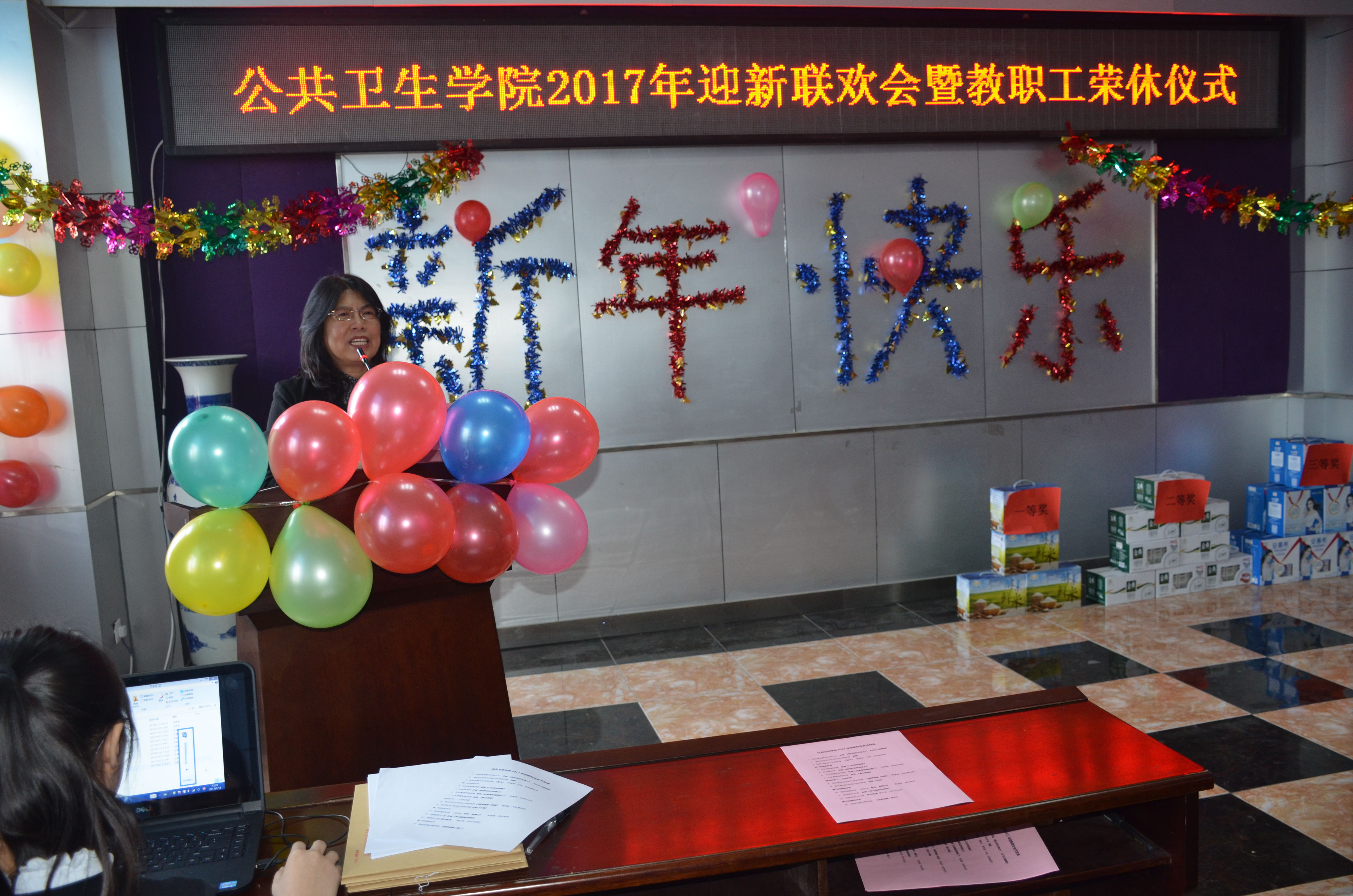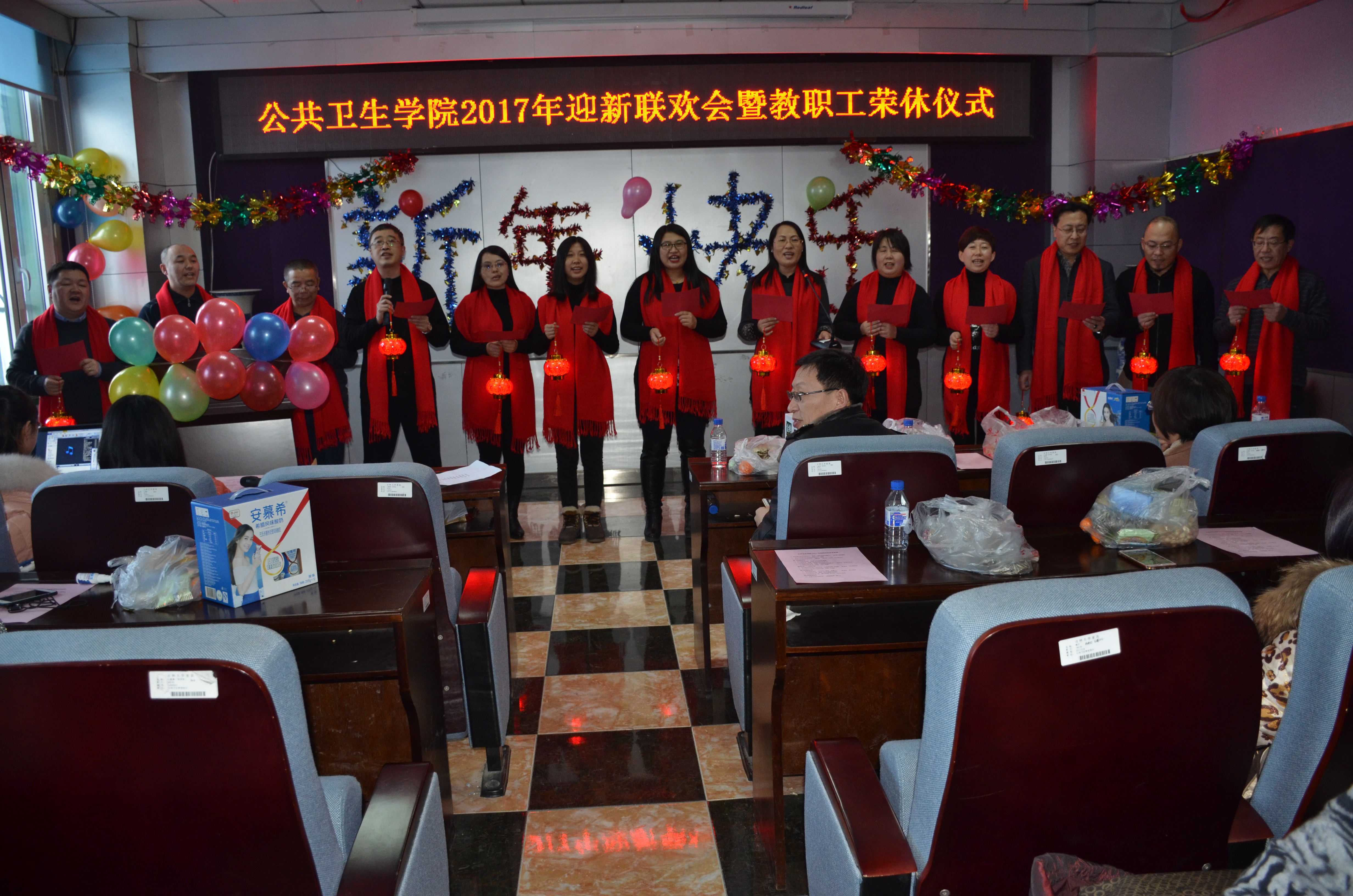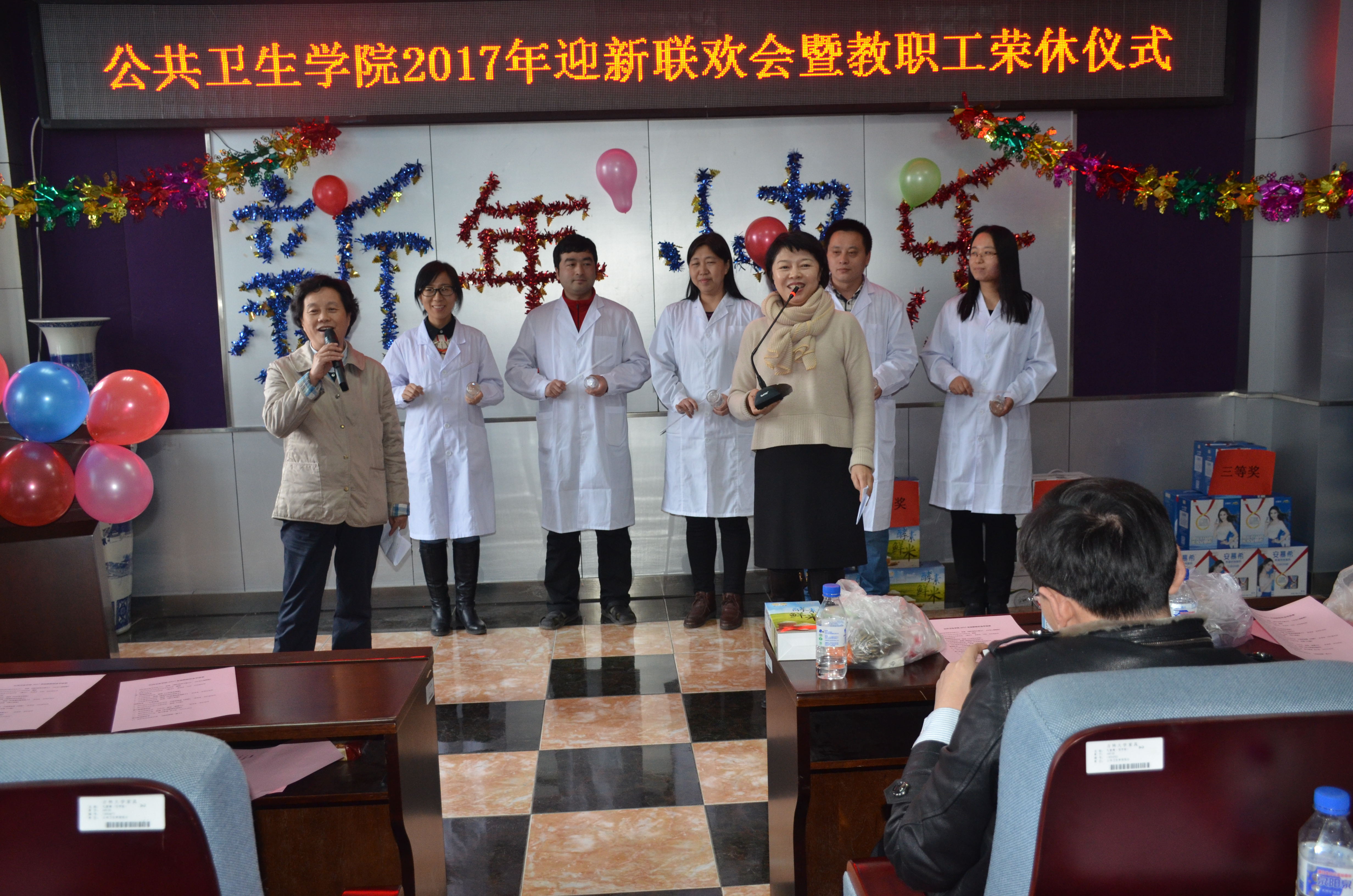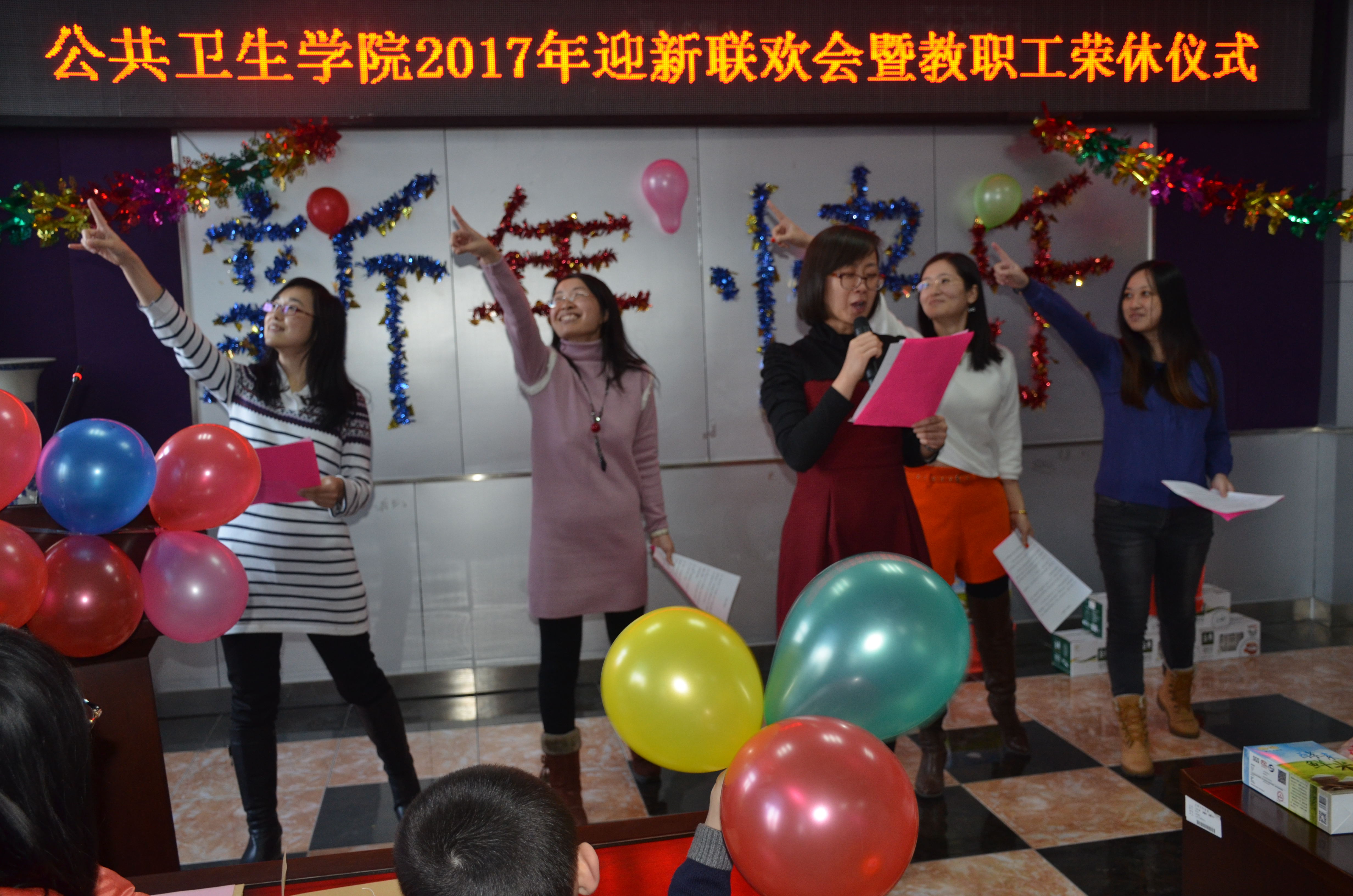 迎新联欢会在一曲合唱《我们走在大路上》、《公卫人唱新歌》中拉开序幕,接着各科室的舞蹈、合唱、独唱、诗朗诵、小提琴独奏《鸿雁》、脱口秀《2016那年、那事儿》、即兴表演等纷纷上演,将联欢会推向一个又一个高潮,在节目中穿插的游戏环节和抽奖环节更是活跃了现场气氛,掌声、欢笑声、呼喊声此起彼伏,精彩纷呈,整场晚会历时近3个小时,最后在一曲合唱《相亲相爱的一家人》中落下帷幕,全院教职工在欢声笑语中迎接即将到来的假期和新年!