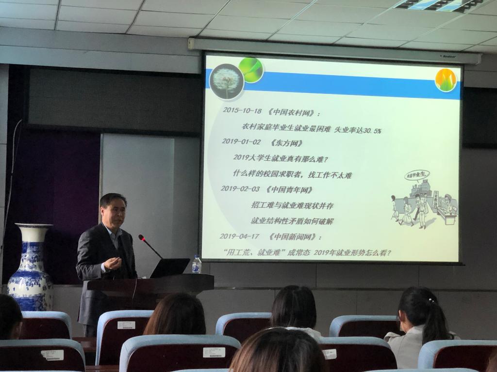 首先,于洗河教授以实例及独特的见解向同学们分析了全国不同教育程度大学生的就业情况与形式,同时介绍了研究生应掌握的人文素质与品质素质。随后,于洗河教授深入浅出的讲解了研究生在成长、发展中所经历的四个层次,教导同学注重自我审视。最后于洗河教授给予出宝贵建议:一、对于就业,首先是积极就业,轻易不要尝试自主创业;对于职业选择,首选是对口的专业岗位,而且一定要从基础做起;对于个人发展,根本保证是不断提高自身的职业素质和职业能力,否则很快就会被淘汰。二、尽管就业是资方市场而且压力很大,但用人单位永远欢迎最具职业能力和职业素质的人。三、对于研究生来说,职业素质的培训不是应不应该参加的问题,而是选择什么样的培训的问题。四、早醒悟、早关注、行动迅速才有出路!