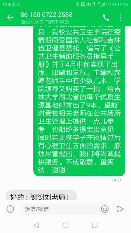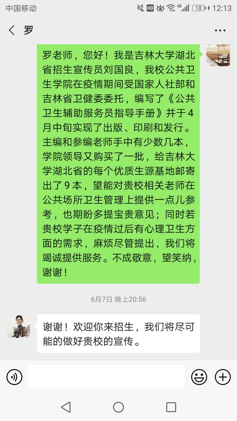 、湖北省孝感高级中学等21个吉林大学“优秀生源基地”,免费邮寄了200本《公共卫生辅助服务员指导手册》。