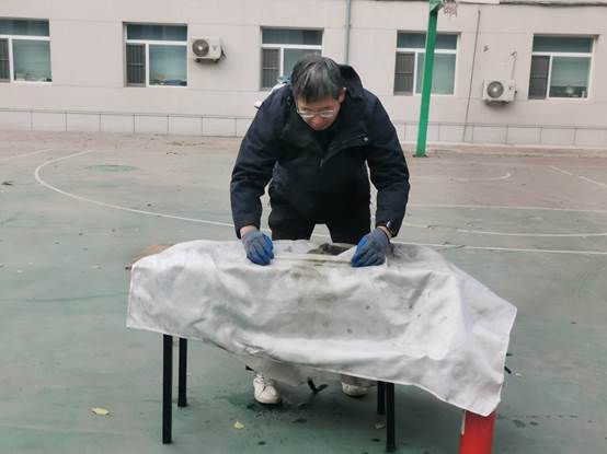 室外避难所。待全部人员集中在避难所后,安志成科长为师生演示了常用灭火器材二氧化碳灭火器和灭火毯的正确使用方法和注意事项。讲解后,参演师生进行了两种灭火器材的使用练习。
