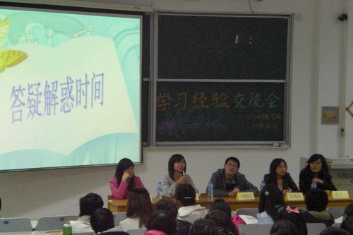 首先,学习部成员赵志伟为大家进行了详尽的专业介绍。随后,是答疑环节。在这一环节,学弟学妹们从学习方法到评奖评优,从人际交往到生活工作这几方面提出问题,五位学长学姐非常热心地进行了答疑。最后,07级以优异成绩保研的学姐张晴晴对活动进行了总结。她希望同学们从这次活动中有所收获,好好把握自己的大学生活!