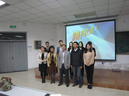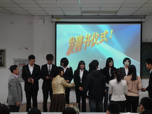 领导和老师为学生会主席、副主席、各部部长颁发了聘书。