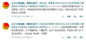 和各班团支部的官方微博进行转发。活动过程中,同学们时刻关注微博上相关动态,并相互交流自己的心得、体会与收获,使活动取得了巨大的成功。