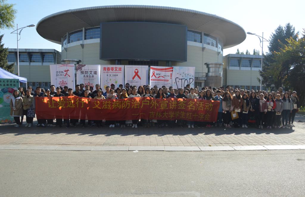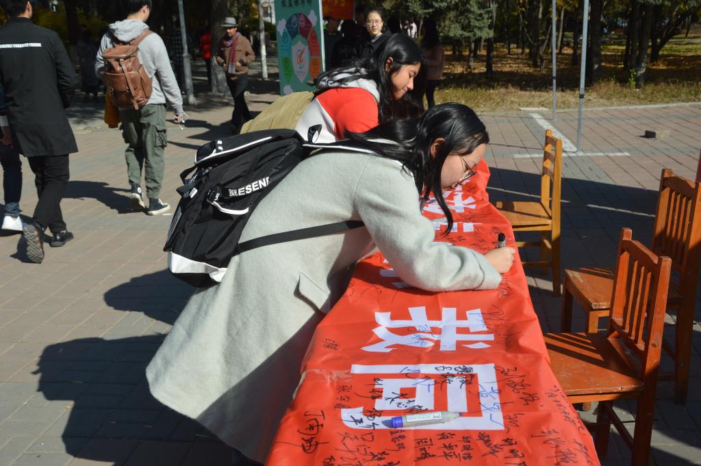 同学们发放艾滋病知识宣传手册。中午十二时,活动正式开始,陆续来到活动现场,在工作人员的带领下戴上了防范艾滋病的标志徽章,并在宣传条幅上签名以表示对祖国“防艾”事业的支持。随后,工作人员引导同学们观看了展板上的艾滋病相关知识,并正确客观地解答了同学们的疑问。由于本次活动形式新颖、内容充实,也吸引了许多外国友人参与。活动最后,同学们与工作人员共同在展板前合影留念。