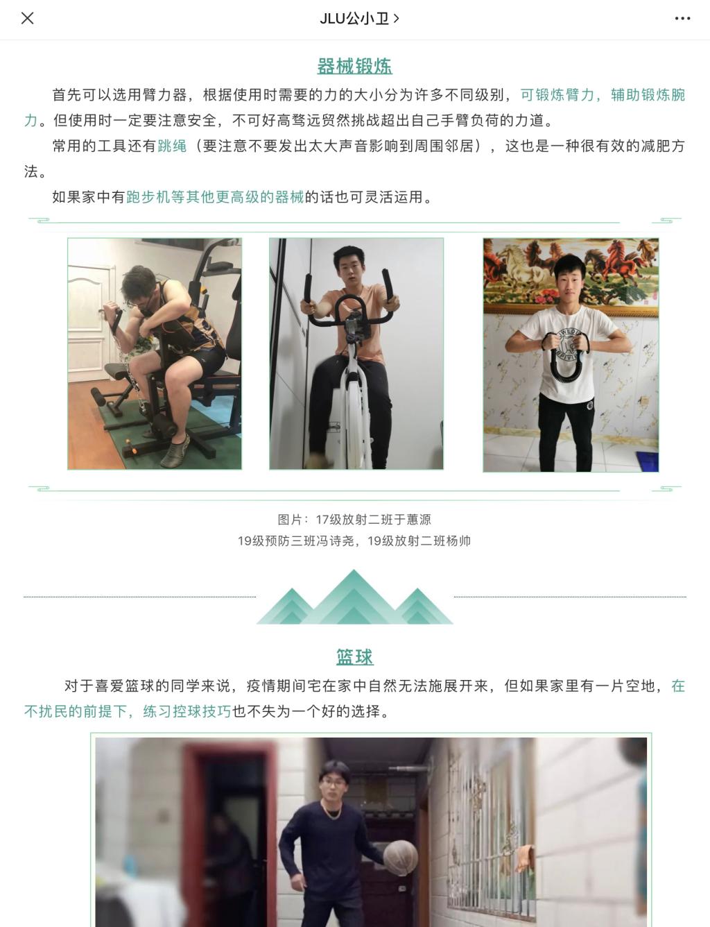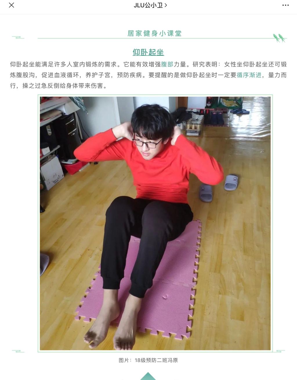 全体本科生开展了以“强身健体,抗击肺炎”为主题的居家健身活动。本次活动不仅以推文、照片和视频方式进行在线健身教学指导,也展现公卫健儿们别样的青春风采。