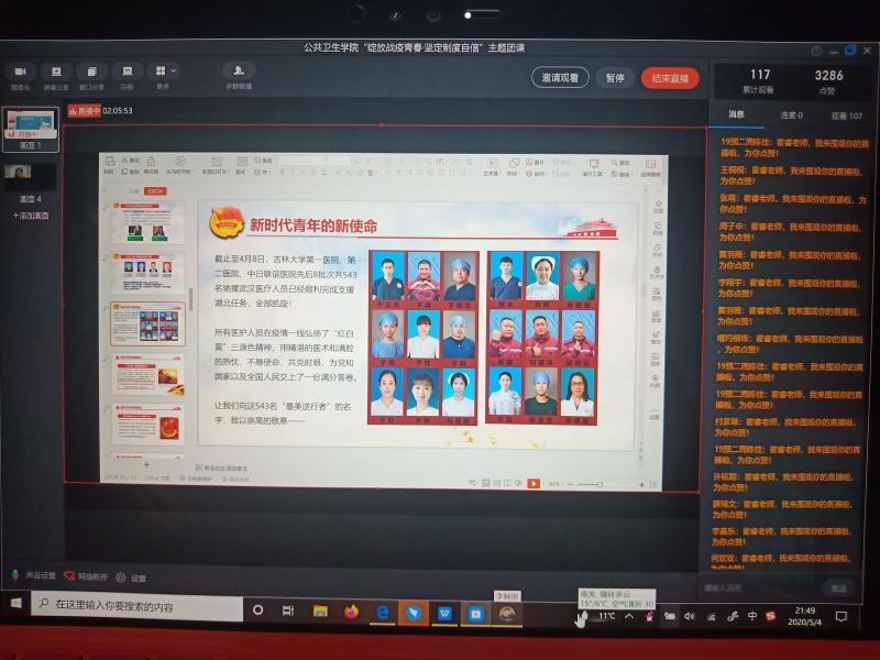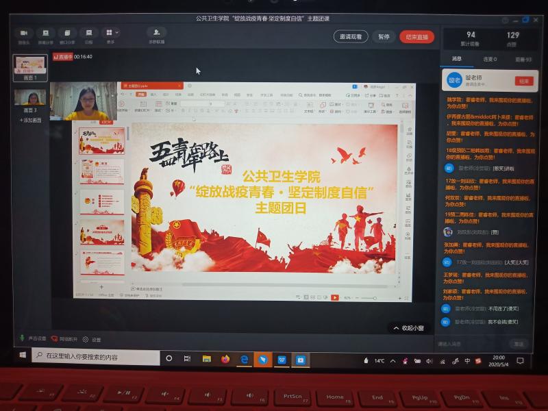 于5月4日晚8时通过“钉钉”平台召开了“绽放战疫青春·坚定制度自信”主题团课教育。公共卫生澳门六合彩