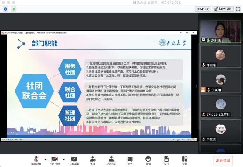 分别于5月25日和5月28日在线举行了第三十六届团学组织部长、部员换届大会。各部门参选成员从总结工作经验出发,阐述了自身优势,并对未来工作发表了展望。结合在线投票结果,经澳门六合彩