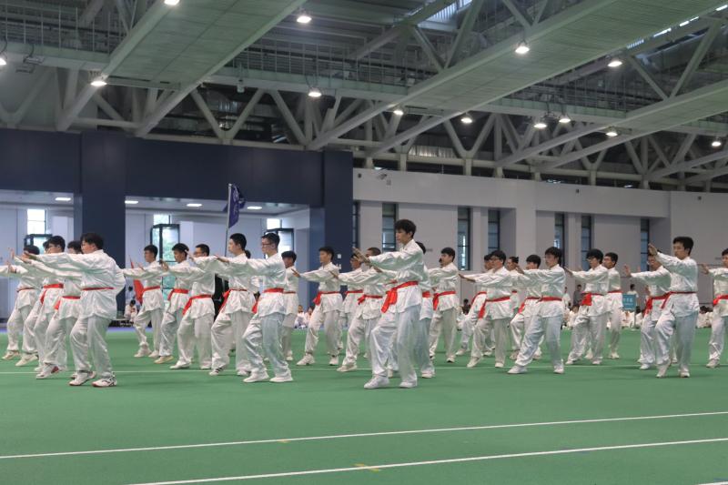 本次活动于下午两点半正式开始,受到天气的影响,比赛转到体育馆内进行。即使天气不佳,同学们的热情却丝毫未受到影响,各个兴高采烈。随着“起步——走!”的高昂口号,队员们迈着整齐的步伐,英姿飒爽地走向了场地中央,伴着“公行天下,卫戍健康,逐梦扬威,共创辉煌”的响亮口号,立正站好,准备开始。随着音乐声响起,队员们拉开架势,开始了八极拳展示。“悟空问路”,“十字顶肘”等动作一气呵成,矫健有力,一招一式中蕴藏力量,整体动作整齐划一,全套八极拳动作也是不徐不疾、行云流水。最后,伴随着裁判员的结束语,本次比赛正式落下了帷幕。