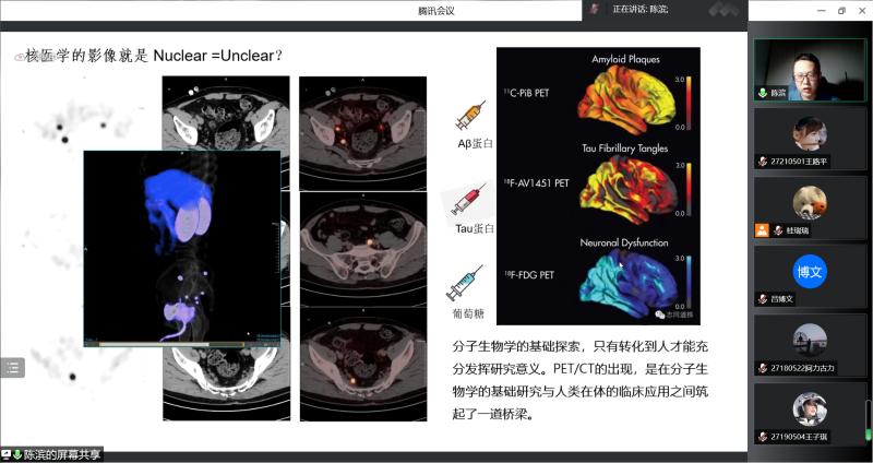 作为本次讲座的特邀嘉宾,吉林大学中日联谊医院核医学科副主任医师、医学博士、硕士生导师、中国影像技术分会青年委员陈滨教授详细讲解了核医学的就业方向、整个核医学科与相关科室的发展现状,并耐心解答了同学们内心的疑惑,讲述通俗易懂,深入浅出。