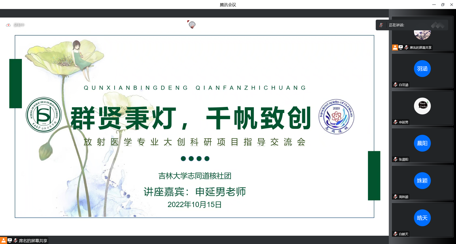 放射医学专业大创科研项目指导交流会。本次会议邀请了放射生物学教研室主任申延男教授作为讲座嘉宾莅临指导。党委副书记兼副院长刘金超、辅导员苏国范、辅导员冷贺璇以及2021、2022级同学参与了本次会议。