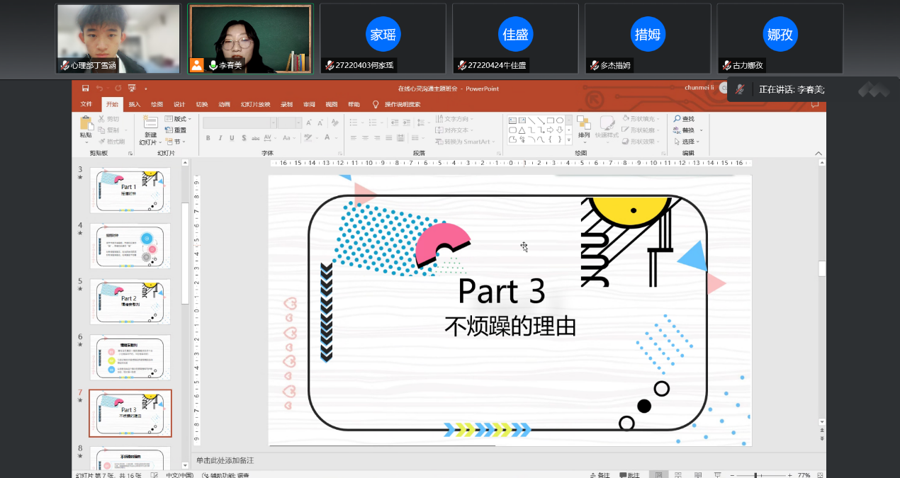 The successful implementation of the "spiritual communication" theme class meeting not only alleviated the psychological pressure of students during the epidemic, promoted communication between students, enhanced group cohesion, but also improved students' mental health knowledge, and improved their ability to understand and analyze, resolve conflicts, and relieve pressure. I believe that students can face college life with a positive and optimistic attitude and harvest a beautiful and full life experience.