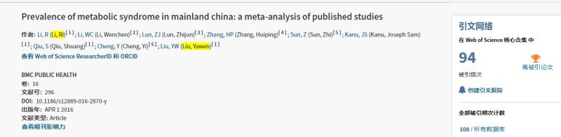 In April 2016, Professor Liu Yawen's team published the paper "prevalency of metabolic syndrome in mainland China: a meta-analysis of published studies" in BMC public health, which was selected as the top papers of the General Social Sciences (top 1% of the papers cited in this discipline), and was cited 80 times, accounting for 5% of the total papers cited in the general social sciences. Professor Liu Yawen's scientific research team has formed a number of high-quality academic achievements after years of in-depth research in the direction of chronic disease prevention and control. The inclusion of this article in ESI top papers indicates that the achievements have attracted the attention and recognition of international peers, formed a certain international academic influence, and played a role in promoting the construction of public health discipline in our university.