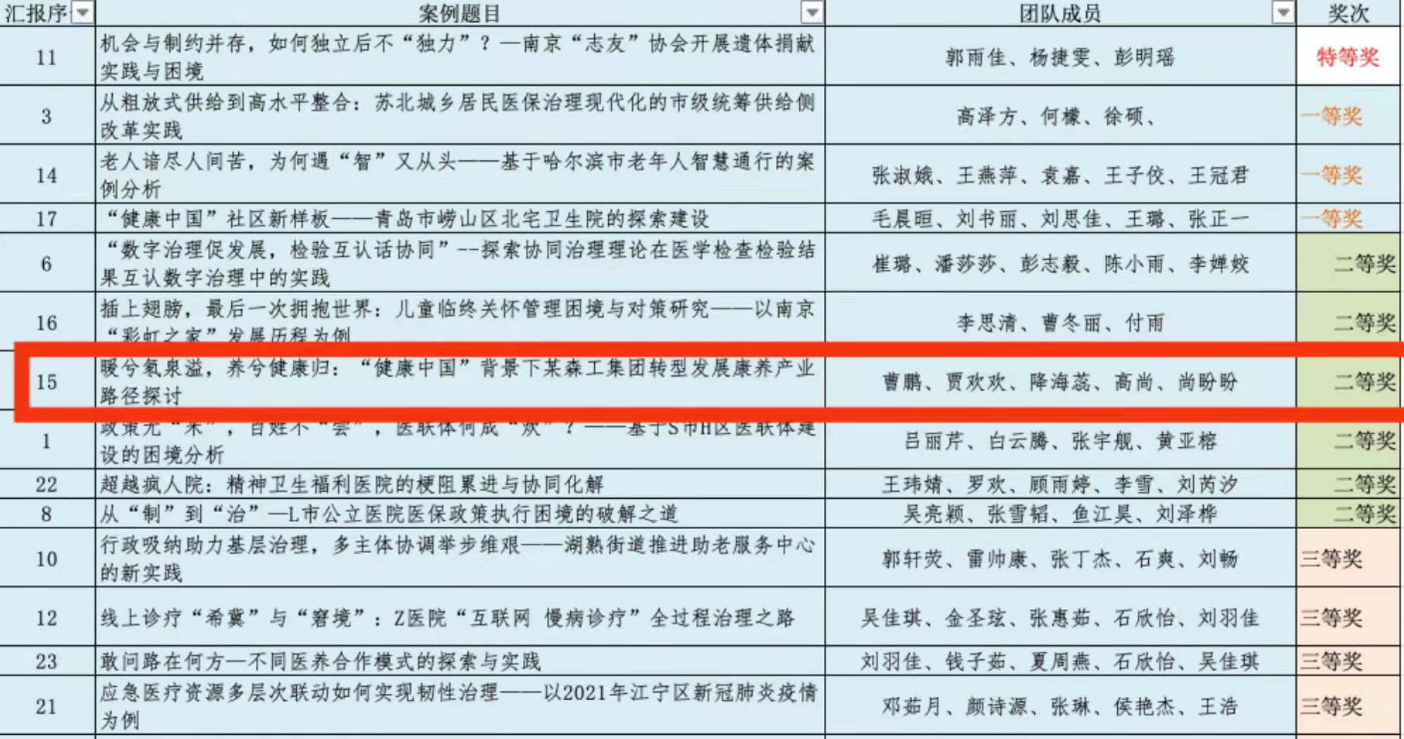 This competition was hosted by Nanjing Medical University, and hosted by the School of Medical Affairs of Nanjing Medical University and the Jiangsu Institute of Health of Nanjing Medical University. 126 teams from 35 universities across the country signed up for the competition, and 23 teams finally entered the finals. The selected topics of the participating cases cover many fields such as medical service, combination of medical care and nursing, health emergency, smart medical care, public health, medical security, health environment, health industry, etc. Cao Peng, Jia Huanhuan, Jiang Hairui, Noble and Shang Panpan, five students from the research group of Professor Yu Xihe of the School of Public Health, based on the project they undertook during the epidemic, won the second prize of the postgraduate group of the competition by virtue of the case "Warm Radon Spring Overflow, Healthy Return: Discussion on the Path of a Forest Industry Group's Transformation, Development and Health Industry in the Context of" Healthy China ".