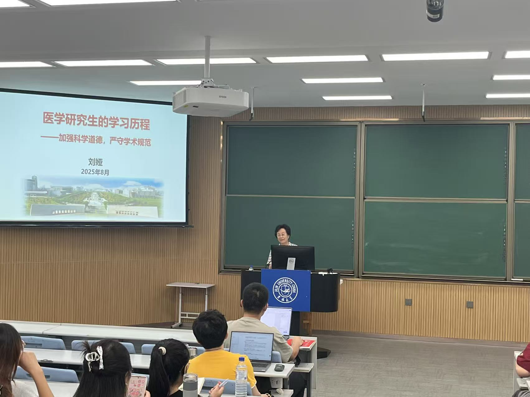 人才培养目标,系统解读了科学道德与学风建设的相关管理规定,深刻阐释其核心要义与重要意义。她强调,“科学道德是科研工作的灵魂,学风是学术发展的基石”,对于医学研究生而言,良好的科学道德素养与严谨的学术作风,不仅是完成学业、开展科研的基本前提,更是未来在公共卫生领域深耕细作、担当社会责任的核心支撑。她呼吁新生们从入学之初便树立敬畏之心,自觉传承科学家精神,将科学道德准则融入学习科研的每一个环节,努力成长为兼具专业能力与高尚品格的科研人才。